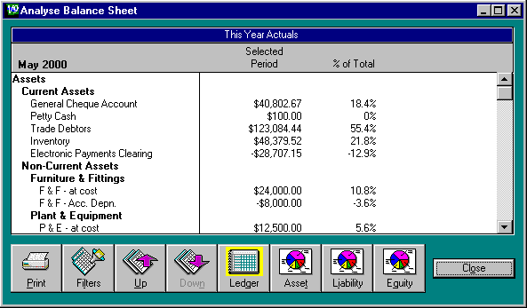 Click on OK . The analysis you specified will be displayed in the Analyse Balance Sheet window.