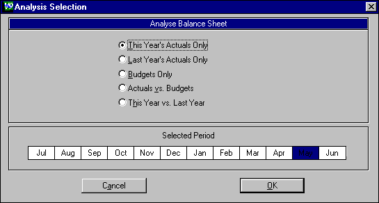 Select what you want shown in the analysis (this year's actual figures, this year's budgets etc) by clicking on the appropriate radio button.