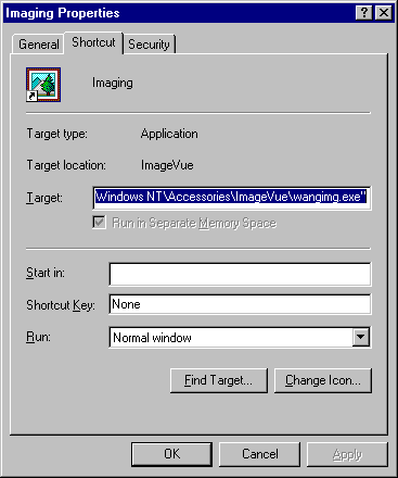 The next step is to set up the Imaging shortcut so it runs in a window on the desktop when Windows 95 first starts up.