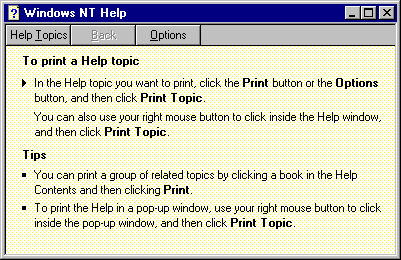 - Click on the Options menu. To print out this help topic, select Print Topic. The Print dialog box appears and you proceed from here as usual.